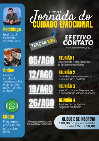 O programa é prático e acolhedor: inclui vivências, exercícios, metáforas, psicoeducação, orientações diretivas e validação real de suas dificuldades. Tudo isso em um ambiente de apoio e cuidado em grupo.